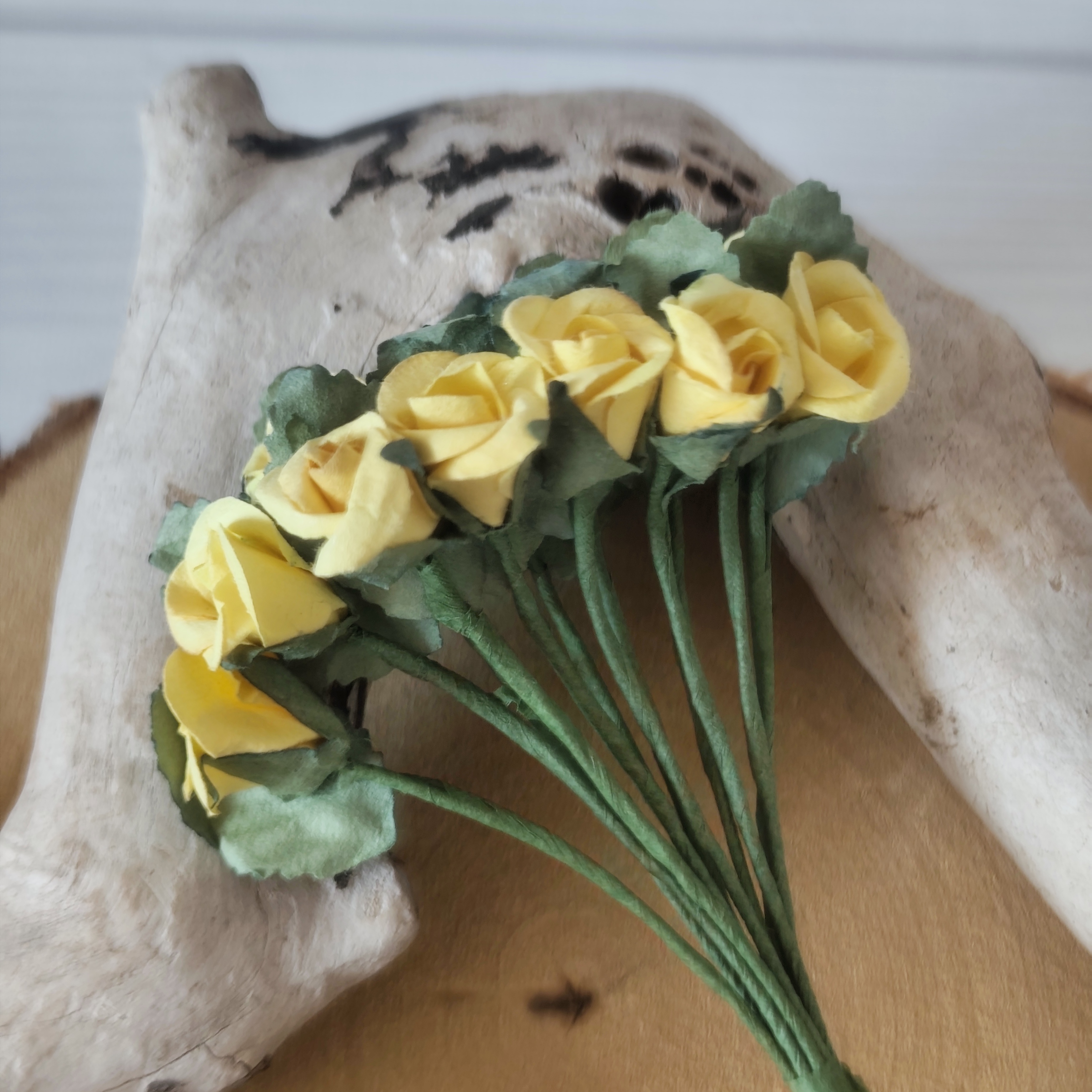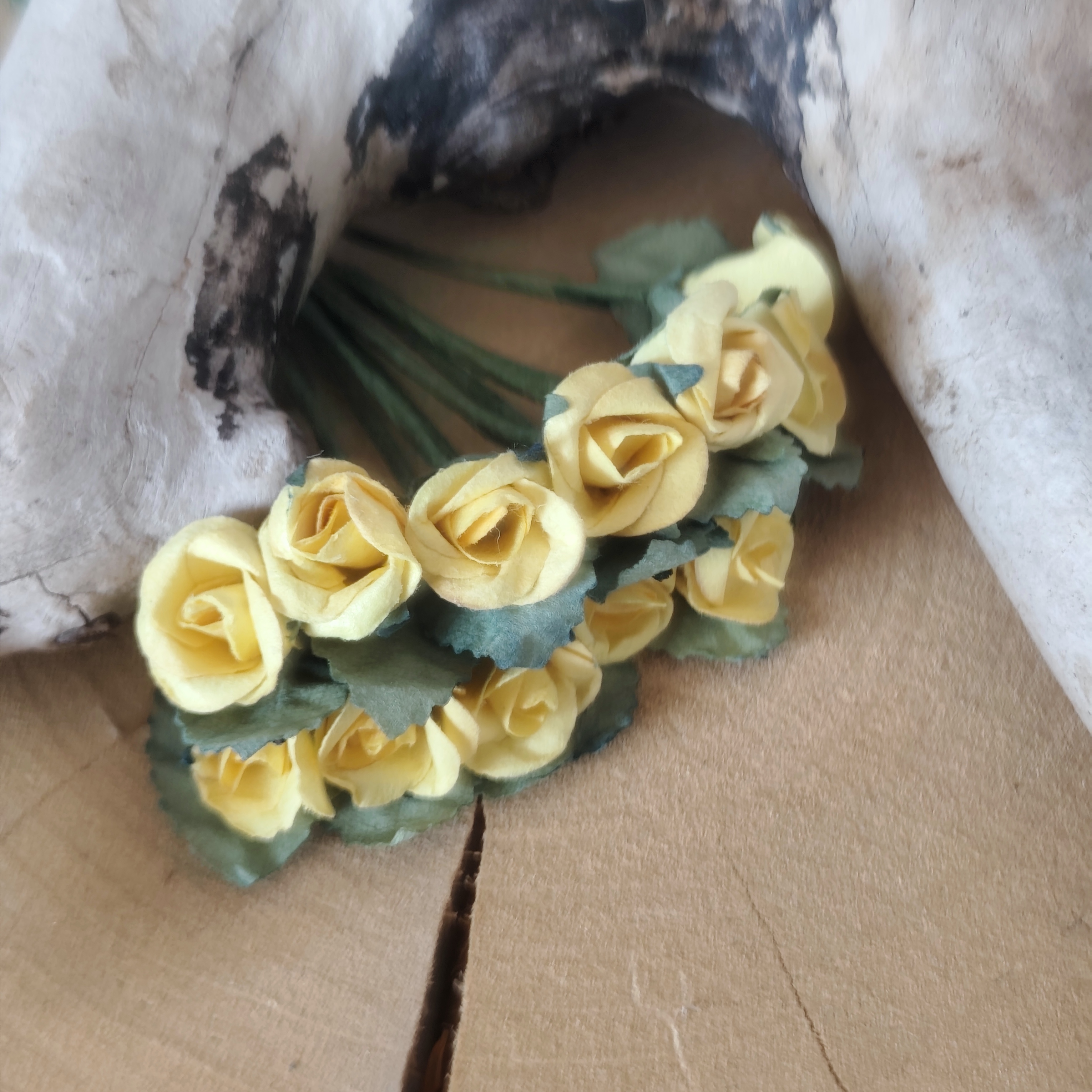 Zestaw 12 różyczek papierowych w kolorze żółtym. Pączki kwiatów z listkami. Idealne jako uzupełnienie kompozycji do kartek, albumów i innych prac.